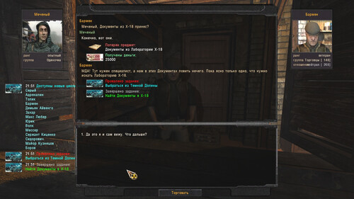 "Найти артефакт «Чёрный ангел». Он находится в Ржавом лесу на Радаре. Отнести артефакт Волку. В благодарность он даст наводку на тайник с броником на Армейских складах. Найти тайник Волка. Он создаётся случайным образом на вершине одного из скальных образований вокруг разбившегося вертолёта. Отдать ствол Кресту. Крест примет долг, но скажет, что ему нужен его ствол. После этого станет известна информация о тайнике Креста с броником в лаборатории Х-16." «Если ты один раз попал в Зону Отчуждения, она не отпустит тебя уже никогда!»